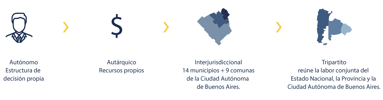 Es tripartito porque reúne tres Estados: Nación, Provincia de Buenos Aires y Ciudad Autónoma de Buenos Aires. Es interjurisdiccional porque abarca 14 municipios de la Provincia y algunas comunas de la Ciudad.